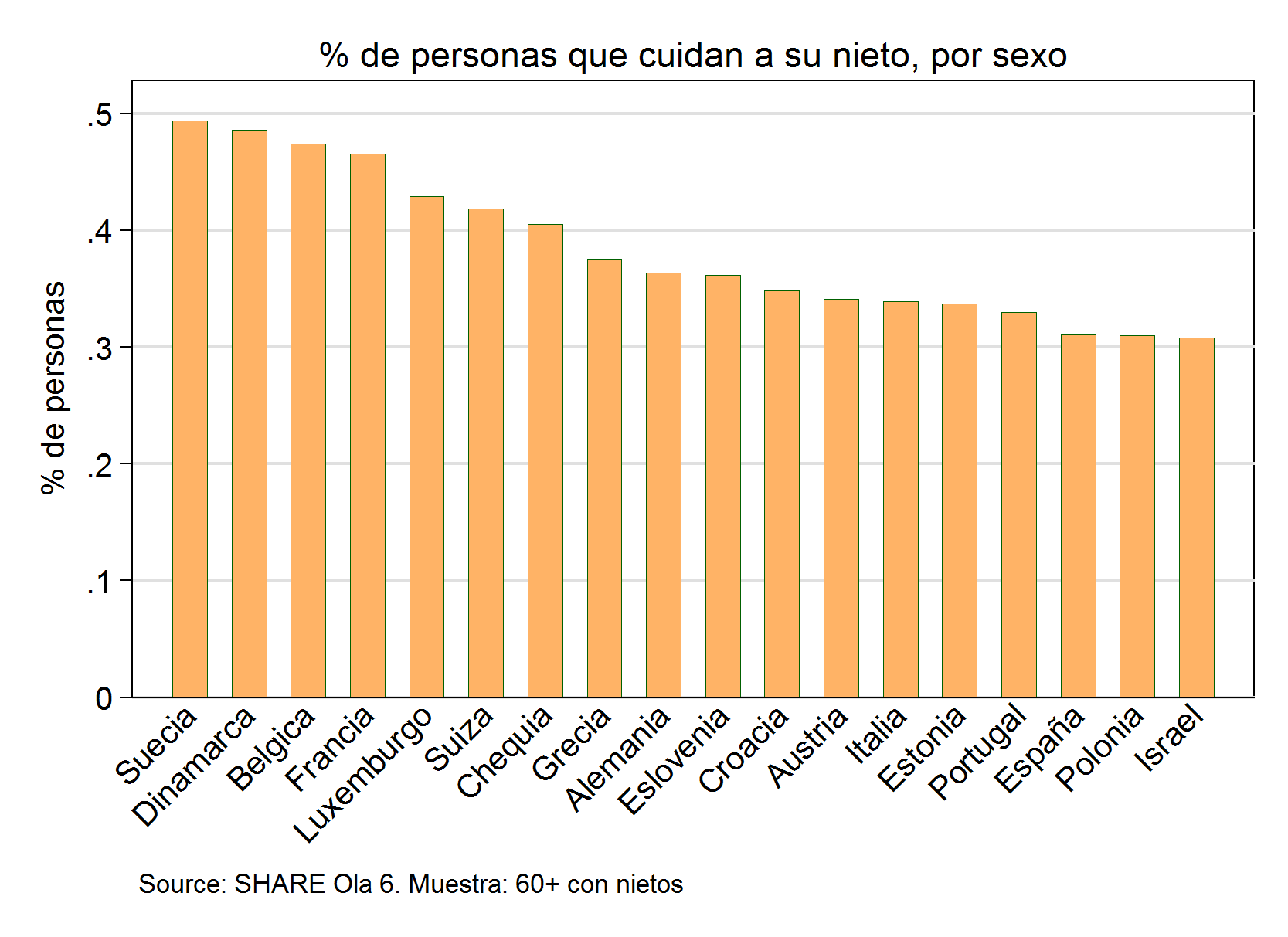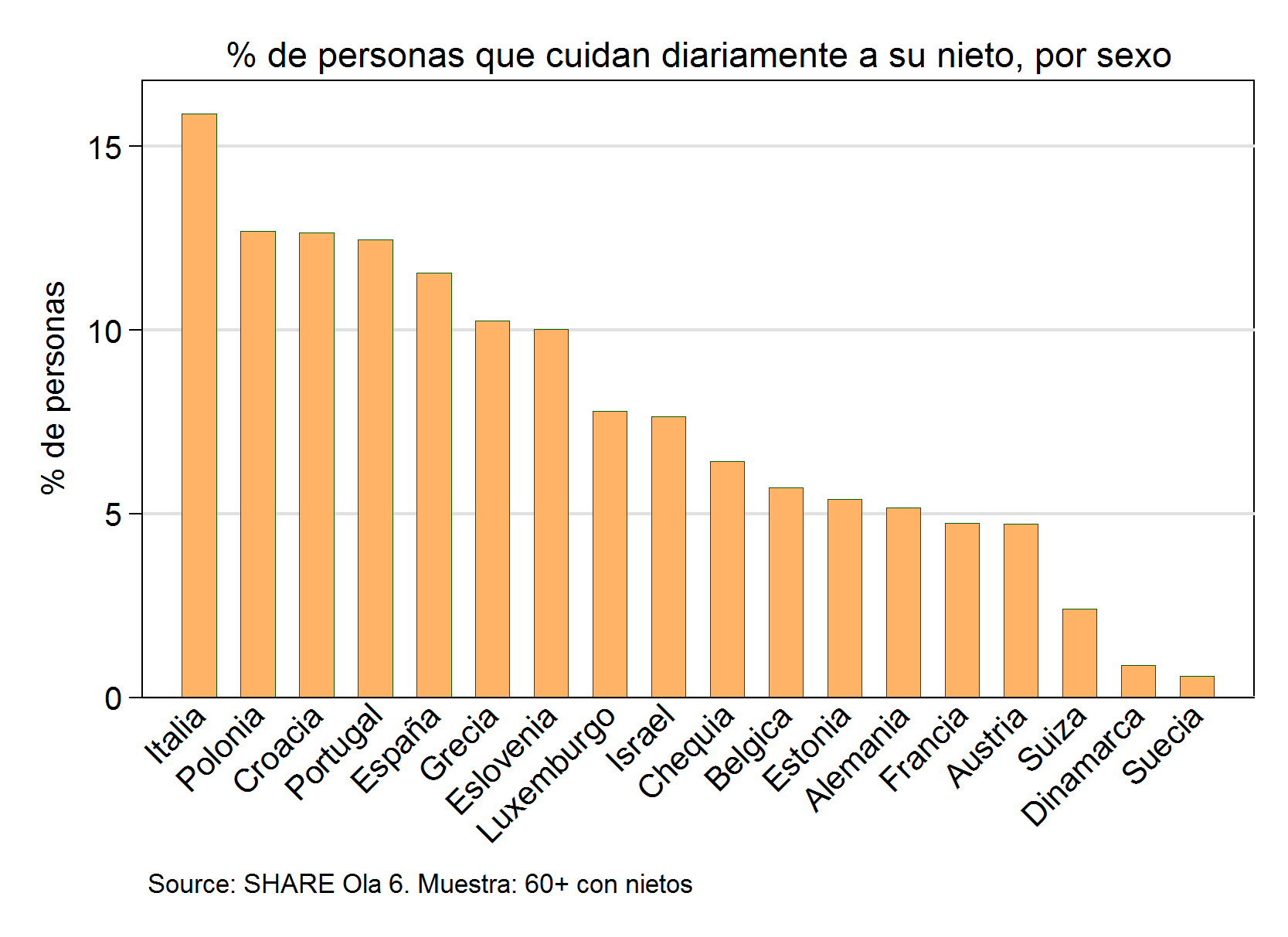 Las personas mayores proveen ayuda a los miembros de la familia de muchas maneras, entre ellas está el cuidado de los nietos. Para el gráfico siguiente, se ha restringido la muestra a las personas de más de 65 años, que tienen al menos un nieto. Si analizamos el porcentaje de personas que cuida diariamente a sus nietos vemos que el gradiente norte-sur también está presente, pero parece esta vez que los abuelos cuidan más a sus nietos en los países del Norte que en los del Sur.