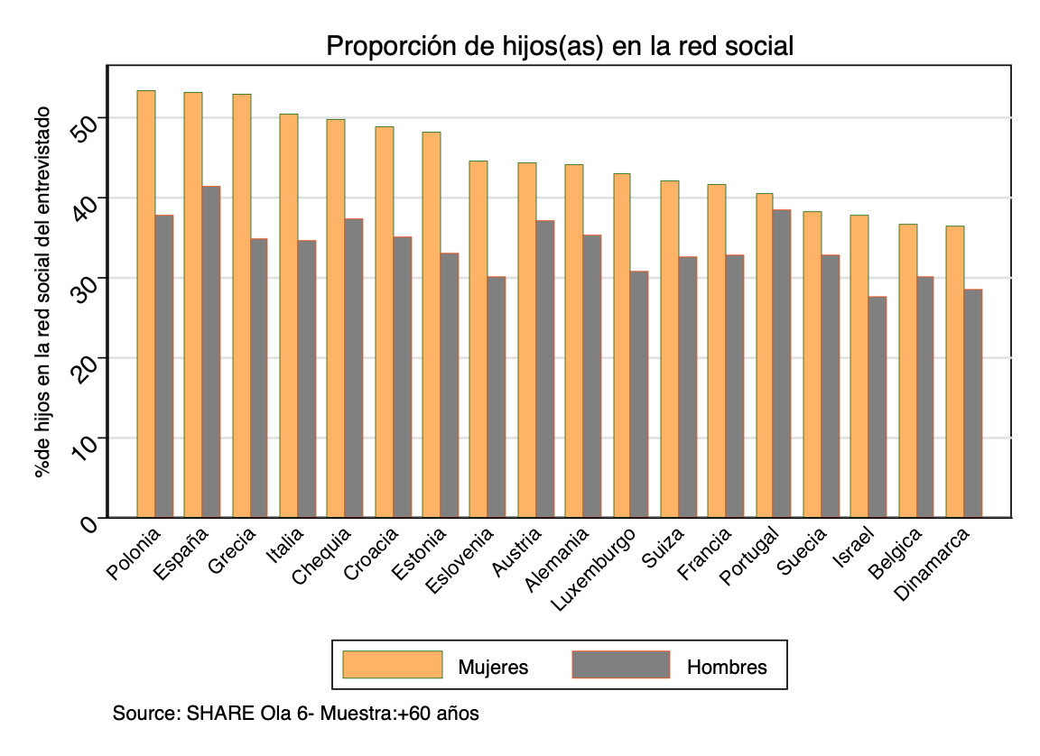 La red social suele formarse de la familia del encuestado (muchas veces la pareja es la primera persona mencionada pero los hijos y los hermanos también ocupan una posición importante), de amigos, de cuidadores formales, etc. En el gráfico siguiente medimos la proporción de hijos en la red de los individuos de 60 y más en cada país en la ola 6. Los países del Este y del Sur de Europa mencionan más a sus hijos como personas de confianza con quienes hablan que el resto de países de SHARE. Esto es particularmente cierto para las mujeres, quienes siempre mencionan más a sus hijos que los hombres. Más información.