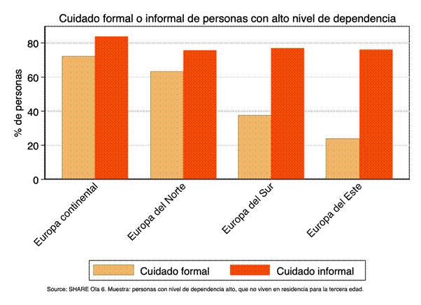 Si la proporción de gente con alto nivel de dependencia recibiendo cuidado informal es bastante estable entre cada grupo de países, la proporción de individuos con nivel alto de dependencia recibiendo algo de cuidado formal varía mucho: si es el caso del más de 70% en Europa Continental, esa proporción es muy baja en Europa del Sur y aún más en Europa del Este.