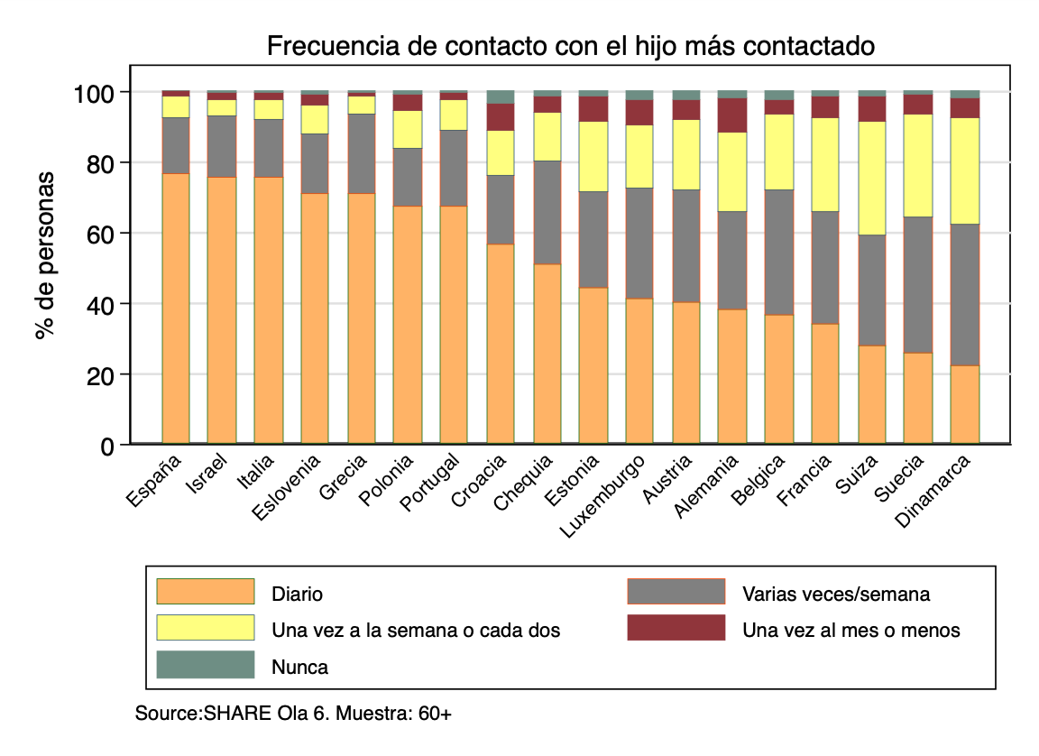 Estas diferencias también se pueden apreciar si analizamos la frecuencia de contacto de los padres con su hijo más contactado. En el gráfico siguiente España ocupa el primer lugar, es decir que casi el 80% de los padres de más de 60 años contactan diariamente con algun hijo (si es que tienen algún hijo). Esta proporción apenas sube a un 22 por ciento en el caso de Dinamarca. De nuevo se nota con claridad el gradiente norte-sur.