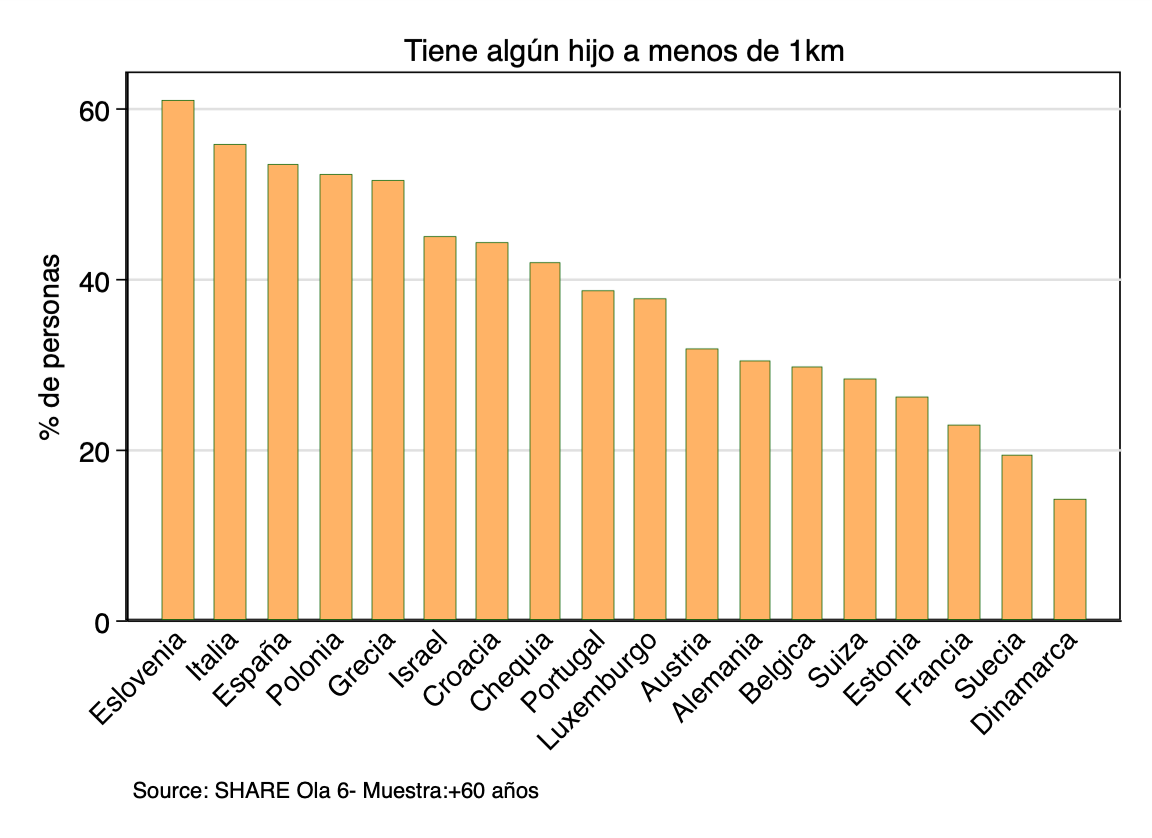 En el gráfico se puede apreciar la existencia de un gradiente norte-sur. En los países del sur de Europa los lazos familiares suelen ser más fuertes, lo que se refleja en la distancia a la que vive el hijo más próximo. Entendemos por menos de 1km a todos aquellos hijos que viven a menos de 1km, en el mismo edificio o en el mismo hogar. Este gráfico sólo incluye a quienes tienen al menos un hijo.