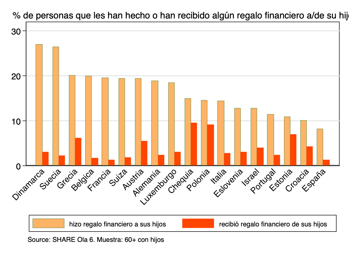 Restringiendo la muestra a las personas mayores de 65 años, España aparece en último lugar respecto al porcentaje de individuos que han realizado algún regalo financiero a sus hijos de más de 250 euros, si lo comparamos con los países SHARE. Aunque los mayores españoles tienen unos lazos muy estrechos con sus hijos como hemos podido ver en los gráficos anteriores vemos que muy pocos les realizan transferencias financieras. Tampoco son muchos en España los padres de más de 60 años que reciben algún regalo financiero de más de 250 euros por parte de sus hijos. Otros países de la ex-unión soviética destacan por tener una proporción de padres que ayudan a sus hijos muy baja pero sin embargo una proporción alta de padres que reciben la ayuda económica de sus hijos. Más información.